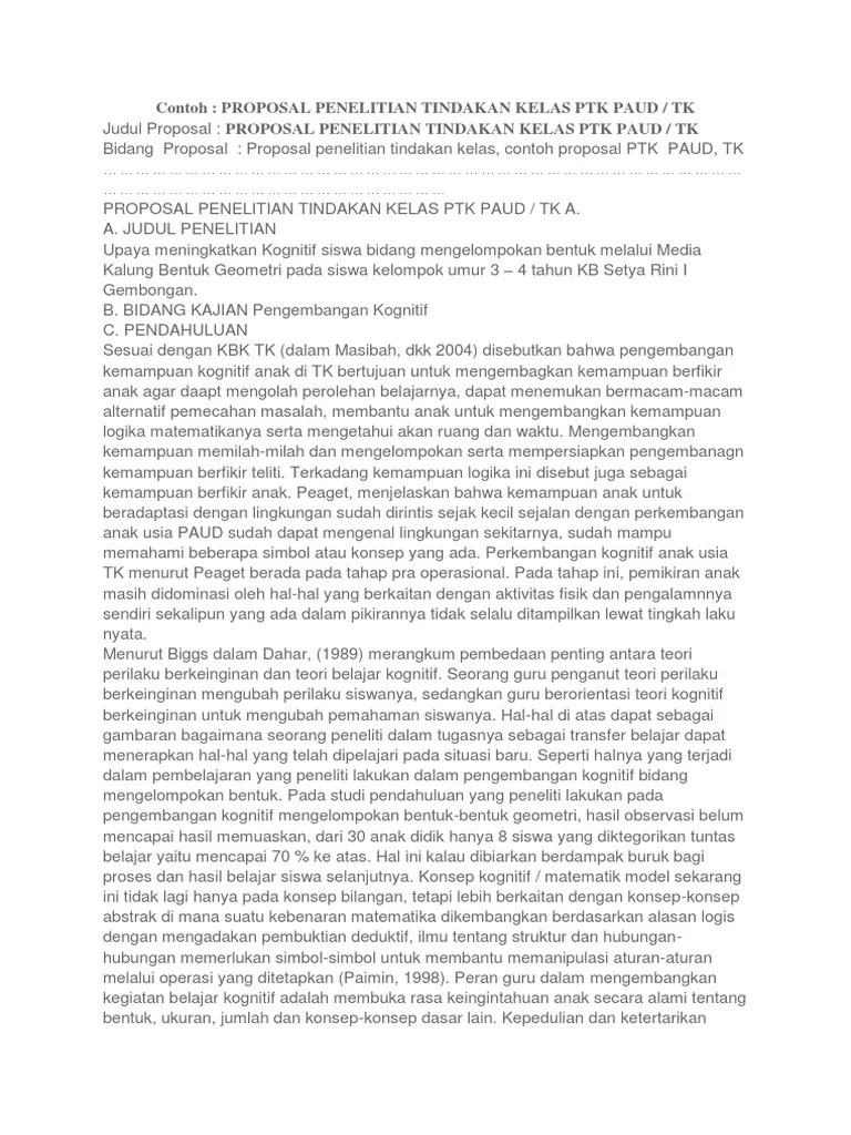 Tulisan kami kali ini akan membahas bebera contoh ptk utamanya jenjang paud/tk. Bidang kajian peng embangan kogni tif. Sharing berkas dan pembelajaran guru paud, tk, ra. Contoh penelitian tindakan kelas mata pelajaran geografi sma pengaruh media peta rupa bumi dalam pembelajaran geografi terhadap hasil belajar siswa kelas xii ips sma Contoh abstrak penelitian tindakan kelas ajoefahmi 150416. Meningkatkan kemampuan mengenal lambang bilangan pada anak melalui jenis permainan tradisional sondah di tk pgri mekarsari : Contoh proposal penelitian tindakan kelas geografi sma penggunaan model pembelajaran kooperatif stad untuk meningkatkan hasil belajar siswa pada mata pelajaran geografi kelas xi sma (proposal) contoh proposal penelitian tindakan kelas geografi sma peningkatan aktifitas belajar pada mata kuliah perencanaan pengajaran melalui metode inquiry (jurnal) Penelitian adalah cara ilmiah untuk mendapat data dengan tujuan dan kegunaan tertentu. Namun sedikit sekali contoh penelitian tindakan kelas paud yang bisa anda temukan di google pencarian. Pengertian ptk terdapat beberapa pengertian tentang penelitian tindakan kelas diantaranya: Contoh pts paud doc,contoh judul pts paud doc,download pts paud 2020,pts paud dan tk lengkap,contoh proposal pts kepala sekolah paud. Proposal penelitian tindakan kelas ptk paud / tk a. Penelitian ini dilaksanakan sebanyak 3 siklus setiap siklus menggunakan prosedur tindakan yaitu perencanaan pelaksanaan tindakan pengamatan dan refleksi.